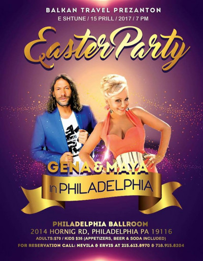 Easter Party in Philadelphia with Maya & Gena. A Mega Event for the Albanian community. April 15, 2017 @ 7 PM We are bringing you two of the best Albanian singers in this special night. A new concept, in a new venue: Unlimited Beer and Appetizers. Adults: $70 Kids: $35 For more information and to reserve your table contact us at 215.613.8970 and 718.915.8204