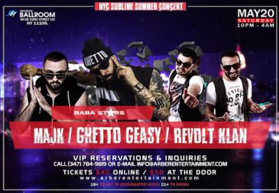 NYC SUBLIME SUMMER CONCERT Featuring MAJK - GHETTO GEAST - REVOLT KLAN - TICKETS: $40 ONLINE | $50 @ THE DOOR ONLINE TICKETS www.arberentertainment.com 18+ To Get In (Great Balcony View) / 21+ To Drink VIP Reservations & Inquiries Please Contact: info@arberentertainment.com