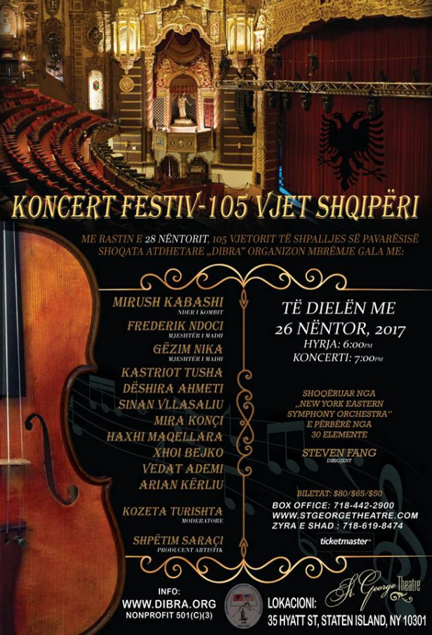 "Shoqata Atdhetare Dibra" me rastin e 28 Nëntorit, do organizoj një Koncert Gala për të gjithë shqiptarët që jetojnë në Shtetet e Bashkuara të Amerikës në një ndër skenat më të njohura të teatrit "St. George theatre" me një kapacitet 1900 vendësh në Staten Island. Ky event përbën një rëndësi të madhe artistike për të gjithë shqiptarë në Shtetet e Bashkuara të Amerikës, pasi do jetë i pari në llojin e tij që do bëj sëbashku emrat më të njohur e të dashur për publikun e gjerë. Bordi drejtues i shoqatës ka punuar vazhdimisht për të nderuar 105 vjet Shqipëri të lirë. Panvarësisht largësisë tonë nga vendlindja, ne dimë të ruajmë vlerat, traditat, e rrënjët tona kuq e zi, si një dëshmi e vazhdueshme që Shoqata Atdhetare Dibra vazhdon të punojë për çështje kombëtare. Biletat dalin në shitje ditën e Premte, 27 Tetor 2017. Per çdo rast mund te telefononi në zyrën e SHAD në: (718) 619-8474 ose info@dibra.org The Dibra Community Organization (a non-profit organization) of Staten Island, New York is organizing a “Gala Concert” to celebrate 105 years of Albania’s Independence. The Dibra Community Organization is bringing distinguished Albanian artists from all over the world to help share our culture, our music and celebrate this occasion. The concert will feature American Pop-Symphonic Orchestra comprising of 30 musicians. This event will take place at the beautiful, majestic St. George Theatre with a capacity of 1900 seats, located at 35 Hyatt Street, Staten Island, NY 10301. We are introducing a high level artistic performance to the Albanian community. It is events such as this one that keeps our traditions and values alive, regardless of the great distance that separates us from home. Tickets will be available for purchase on Friday October, 27th 2017. For additional info call the DCO office (718) 619-8474 or e-mail: info@dibra.org