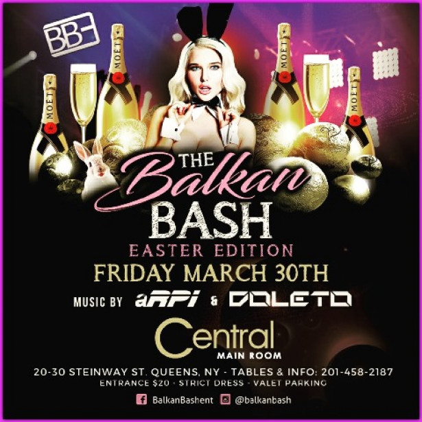 ** The Balkan Bash is back in Central MAIN ROOM on Friday, March 30th! ** DJs aRPi and Doleto are back spinning the best Balkan, house, and HipHop music all night long. The BASH will have Playboy bunny dancers as well as female employees dressed up in sexy bunny costumes. Doors will open 11pm and ages 21+. Only 2 VIP tables left. SEE YOU THERE!