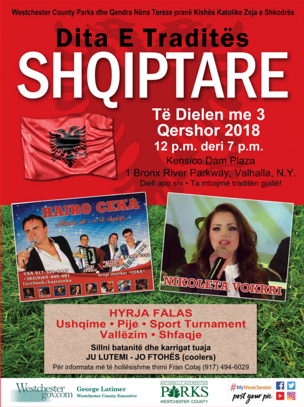 Westchester County Parks dhe Qendra Nena Tereza Prane Kishes Zoja E Shkodres present Dita E Tradites. Hyrja Falas. Ushqim, Pije, Sport Turnament, Vallezim, Shfaqje. Sillni Batanite dhe karrigat tuaja. Ju Lutemi - JO FTOHES. Per informata me te holleshishme thirni Fran Cotaj 917-494-6029 Kensico Dam Plaza