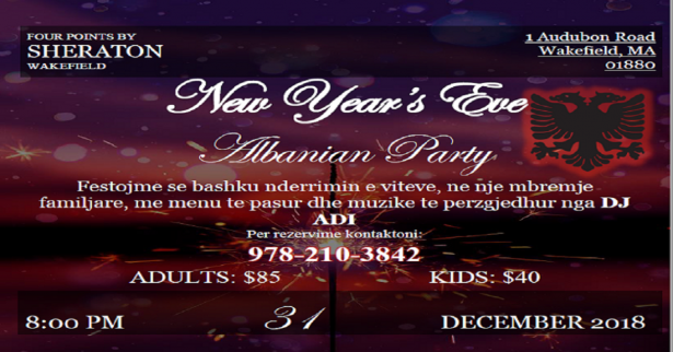 Festojme se bashku nderrimin e viteve, ne nje mbremje familjare, me menu te pasur dhe muzike te perzgjedhur nga DJ ADI. Per rezervime kontaktoni: 978-210-3842 ADULTS: $85 KIDS: $40 Menuja Perfshin: 2 Shishe vere per tavoline Sallate Greke Pule me djath fontina dhe pancetta (e shoqeruara me garnitur) OSE Salmon (e shoqeruara me garnitur) Embelsira te perzgjedhura ( Dessert Buffet Table) Femijet: Chicken Fingers Soda Pitcher Cash Bar do te jete i hapur gjate gjithe mbremjes