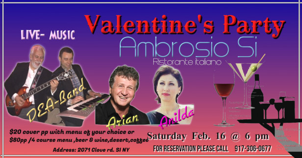 Time to celebrate one of the most tender moment of the year... Valentine's Day @ Ambrosio Restaurant, Romantic dinner, wine and a selection of the mos beautiful love songs of all time brought to your taste from DEA- Band with Arian Kerliu, Anilda jaupllari, Elis LLoshi , Did Tezha........ All inclusive 4 course menu, wine and beer, coffee , desert for only $80 per person ,or $20 cover per person with the menu of your choice. . For reservation please call :917-306-0677