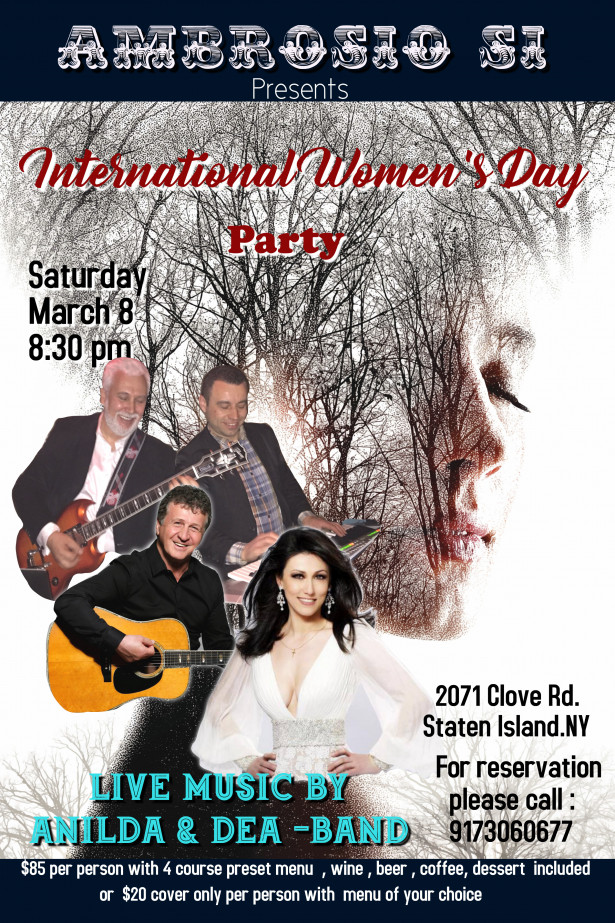 Let's celebrate the international Women's Day , at Ambrosio Si restaurant . Let's have a great time with a very special entertainment brought to you live by DEA- Band with , Anilda ,Arian , Elis and Did . $85 per person 4 course menu dinner will be served, including beer , wine, coffee and desert, induced or $20 cover per person with menu of your choice
