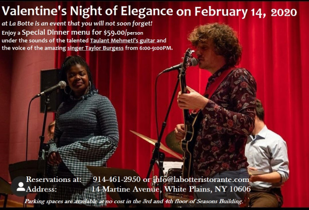 Mbremje e kendshme nen tingujt e Kitaristit te talentuar nga Kosova Taulant Mehmeti! Mos mungoni ne kete nate te cilen nuk do t'a harroni dot menjehere. La Botte ofron menu te vecante dhe ambjent elegant per t'a bere Festen e Dashurise tuaj sa me elegante!