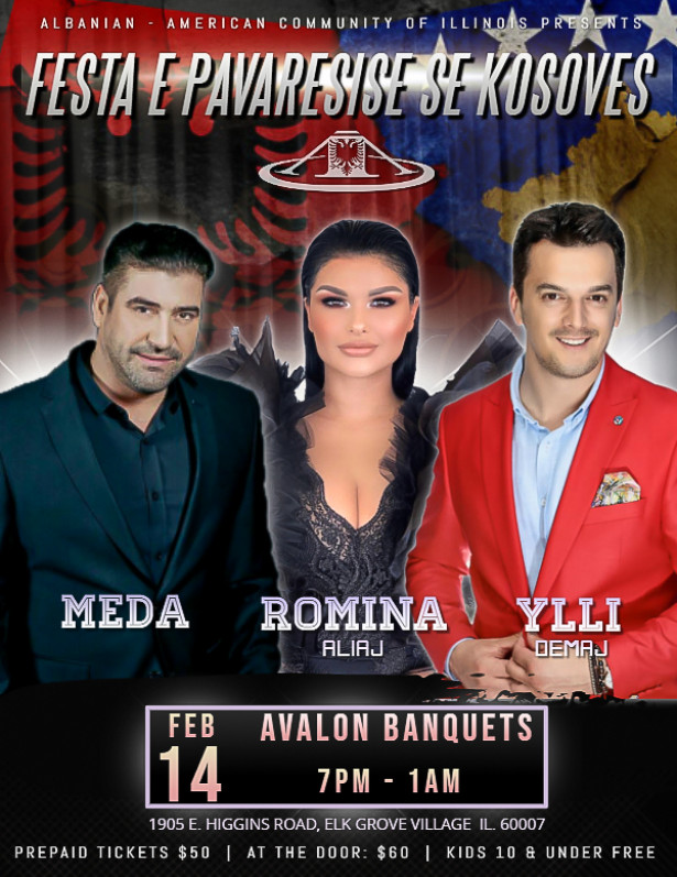 To mark the 12-Year anniversary of Kosovo's Independence, the Albanian American Community of Illinoisis organizing a celebration event where well known artists such as MEDA,Romina Aliaj,and Ylli Demaj will perform. Be proud of your heritage and come celebrate on this magnificent day. Online tickets are $50. At the door: $60. Kids 10 & under: FREE All proceeds go towards establishing a permanent Albanian Cultural Center in Chicago Me rastin e Pavarësisë së Kosovës, Komuniteti Shqiptaro-Amerikan në Illinois (AACI) organizon një mbrëmje madhështore festive. Për argëtimin tuaj do përkujdesen artistët e njohur MEDA, Romina Aliaj dhe Ylli Demaj. Biletat Online: $50. Tek dera: $60. Fëmijët nën 10 vjeç: FALAS.