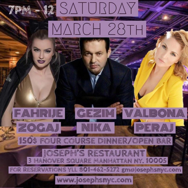 "JOSEPH'S RESTAURANT" Hosting Live Music Event Gezim Nika Fahrije Zogaj Valbona Peraj Saturday March 28th / 7pm - 12 Four Course Dinner / Open Bar "Family Event With Reservations Only" Call or Text Yll (801) 462-5272 gm@josephsnyc.com www.josephsnyc.com