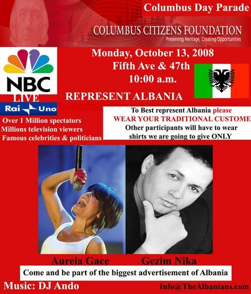 On October 13, Albania will be presented in the Columbus Day Parade we will have a float which will advertise pictures from Albania as well as Aurela Gace and Gezim Nika will be singing. This will be a great event to attend there will be a million spectators watching and will be broadcasted on NBC Live and Raiuno. DJ Ando will be spinning his music and all we need is your support to show up and support this great event. There will be people who will be wearing traditional costumes as well so please if you have one wear it on the day of the parade. If anyone is interested we are looking for staff members who will help us organize this project. you can send me an email at: ervintoro@thealbanians.com