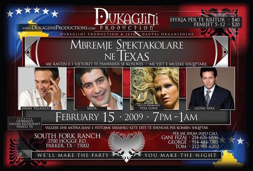 Mbremje madheshtore ne Texas me rastin e Pavarsise se Kosoves. Ejani e festojme se bashku kete dite shenuar. Ju argetojne kengetaret e mirenjohur Sinan Vllasaliu, Meda, Vesa Luma per here te pare ne Sh.B.A, Gezim Nika. Per me shume info kontakto Dukagjini Production @ 914-484-7310 & 212-961-6202