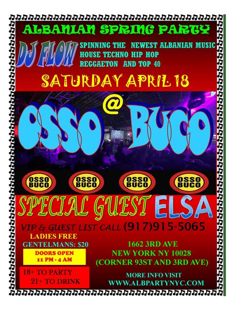 ALBPARTYNYC! PRESENTS ALBANIAN SPRING PARTY APRIL 18 @ OSSO BUCO!! DJ FLOW SPINNING THE NEWEST ALBANIAN MUSIC,HOUSE,THECHNO AND REGGAETON!! DOORS OPEN 11PM-4AM DON'T MISS THIS NIGHT! FOR MORE INFORMATION VISIT OUR WEBSITE: WWW.ALBPARTYNYC.COM