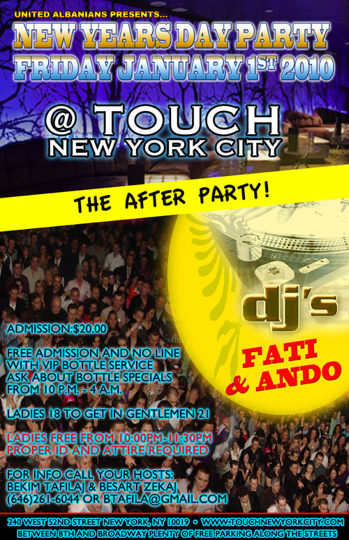 THE ONLY HOT NEW YEAR'S WEEKEND EVENT IN NYC. Host: Bekim Tafilaj Type: Party - Club Party Network: Global Start Time: Friday, January 1, 2010 at 10:00pm End Time: Saturday, January 2, 2010 at 1:00am Location: CLUB TOUCH, 240 W52ND STREET, NYC, NY D
