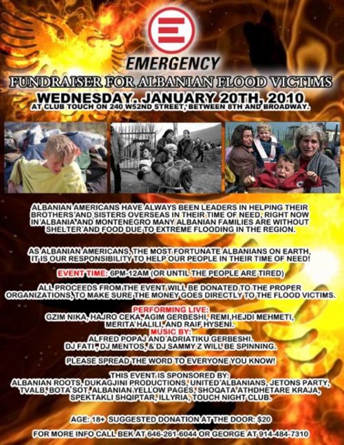 WEDNSDAY, JANUARY 20TH, 2010 CLUB TOUCH... 240 W52ND STREET BETWEEN 8TH AND BROADWAY IN NEW YORK.... 18 TO ENTER... EMERGENCY FUNDRAISER FOR THE ALBANIAN FLOOD VICTIMS! THEY NEED OUR HELP NOW!!!! IT THE ALBANIAN HURRICANE KATRINA! ATTENTION ALL NYC,NJ,CT,PA ALBANIANS....