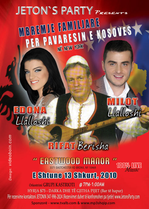 Jetons Party Presents Mbremje Familjare Per Pavarsin E Kosoves Ne New York Me Eonda Llalloshi, Milot Llalloshi Dhe Rifat Berisha Ne Eastwood Manor Adresa 3371 Eastchester Rd Bronx,NY 10469 Hyrja 75 Dollar Per Dark Dhe Pijet Per rezervime Jetoni 347-996-2824