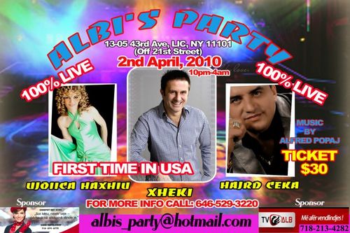Albis Party per ju organizon: Pranvera ne NY me 2 Prill ne restoranin Five Star me kengetaret e njohur nga Kosova ,ku per her te par ne Amerik dote keni mundesin ta ndigjoni live Xhekin ,Vjollca Haxhiun dhe kengetarin e njohur tashme per ju Hajro Ceka, nen orkestimin e Alfred Popaj