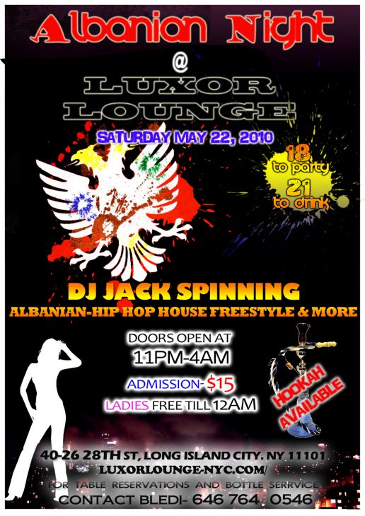 Saturday May 22ND-Albanian Night at Luxor Lounge Dj Jack will be spinning the greatest in Albanian hits as well as hip hop, house, freestyle & of course what ever you the crowd wants to hear. Party begins at 11pm and ends at 4am *********LUXOR LOUNGE IS LOCATED IN 40-26 28TH STREET Long Island City, NY WHICH IS IN QUEENS NY****** 18 TO PARTY 21 TO DRINK ADMISSION IS $15 LADIES FREE TILL 12AM! Come enjoy a night out in one of the finest nightclubs/lounges in Queens NY ...College is out and its time to party and hear your favorite hits and songs from Dj Jack. IMPORTANT INFORMATION HOOKAH WILL BE AVAILABLE THAT NIGHT--- ALSO TABLE RESERVATIONS ARE AVAILABLE AS WELL AS BOTTLE SERVICE FOR MORE INFORMATION YOU CAN MESSAGE ME OR BLEDAR GJANA. OR CONTACT BLEDAR 646 764 0545 HOOKAH INFORMATION Grape Orange Apple Layalina Fruit Special Cappucino Mango Black Grape Eskandarani Blueberry Chocolate Mint Raspberry Pineapple Licorice Peach Rose Guava and Figs Price: $15.00 (refill $7) HOOKAH SMOKING ENHANCEMENTS Shot of any liquor or wine ($8) дус Spicier Effect CUP OF MILK ($3) дус Creamier Effect All our flavors contain 0.05% Nicotine and 0.00% Tar For more Information and for Reservations for tables and Bottle Service Contact Bledi- 646 764 0546 http://luxorlounge-nyc.com/