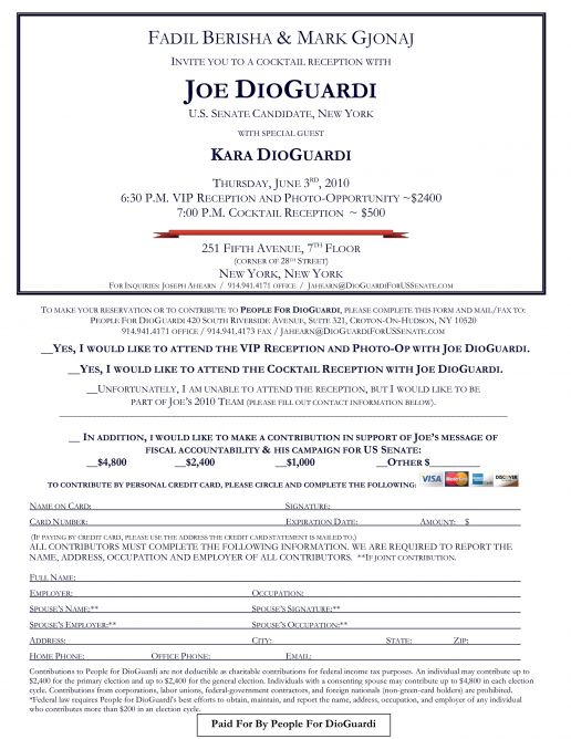Fadil Berisha and Mark Gjonaj Invite you to a cocktail reception with Joe DioGuardi US Senate Candidate, New York With Special Guest Kara DioGuardi