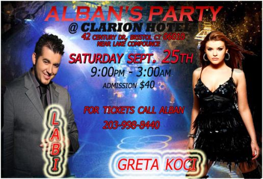 Alban's Party presents Labi and Greta koci live! Saturday Sept. 25 2010 Clarion Hotel 42 Century Dr. Bristol CT 06010 near lake compounce 9:00pm - 3:00am all welcome! for info call Alban 203.998.8440
