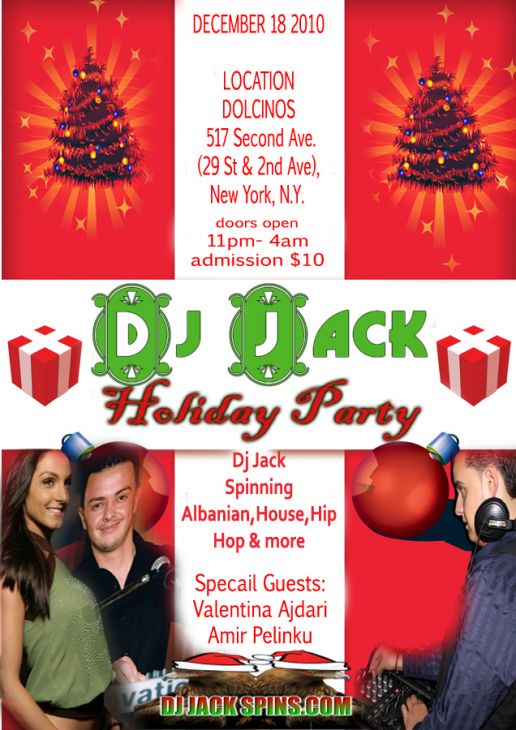 DJ JACK PRESENTS- HOLIDAY PARTY DECEMEBER 18TH 2010 COME OUT FOR A FUN HOLIDAY PARTY TO GET YOUR HOLIDAYS STARTED PERFORMING-DJ JACK WILL BE SPINNING ALBANIAN HOUSE HIP HOP AND MORE *SEND YOUR SONG REQUESTS BEFORE THE PARTY* ALONG WITH VALENTINA AJDARI WHO WILL BE SINGING LIVE WITH THE TALENTED AMIR PELINKU ON KEYBOARD ADMISSION IS ONLY $10 PARTY BEINGS AT 11PM ENDS AT 4AM DRESS TO IMPRESS WWW.DJJACKSPINS.COM CONTACT DJ JACK