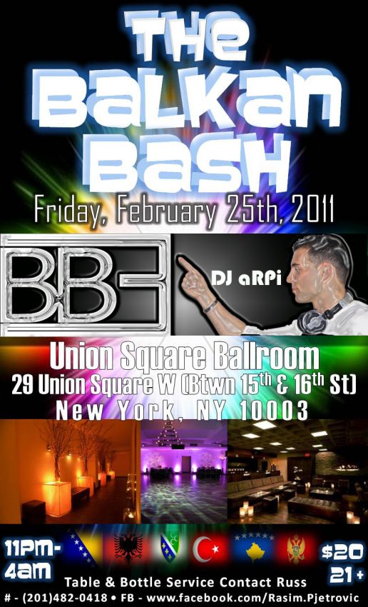 ** It's BALKAN BASH time!!! ** Due to the overwhelming response of the Jan 1 party in Times Square, BBE presents the next BALKAN BASH!!! It will take place at Union Square Ballroom, same location as the Summers Over party a few months back. This time they are opening their private VIP lounge to accommodate more people and bottle service. With 5,000 square feet and 2 bars, this will guarantee less wait for your drinks. DJ aRPi will also be celebrating his birthday so he'll only be spinnin the best in house, hiphop, and balkan (narodna, shqip, & turk). Doors open 11pm - 4am and entrance is $20. You must be 21 to enter, but they do not scan and aren't strict with ID's. Plenty of street parking after 7pm, but I will post a parking garage coupon for those of you who wish to park there instead. Bottles are all $300 but that includes 3 free admissions, tax, and gratuity. Please send Rasim Pjetrovic a facebook message for table reservations, first come first serve. ** See all the beautiful Balkans on Friday February 25th!!! ** www.facebook.com/Rasim.Pjetrovic