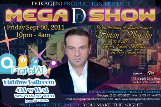 DUKAGJINI PRODUCTON, PRESENTS MEGA SHOW. WITH THE KING OF ALBANIAN MUSIC, SINAN VLLASALIU. 100% LIVE MUSIC BY ROBERT BERISHA & DJ BENGJI. FRIDAY NIGHT SEPT 30, 2011 @ HIGHLINE BALLROOM. 431 W 16st NEW YORK, NY BTW 9th and 10ave 10:00pm~4:00am. 18 TO PARTY 21 TO DRINK, LADIES $30 GENTS $ 40 DRESS TO IMPRESS. FOR MORE INFO PLEASE CALL GEORGE # 212~470~3187, TOM # 212~961~6202 OR VISIT US AT WWW.DUKAGJINIPRODUCTIONS.COM