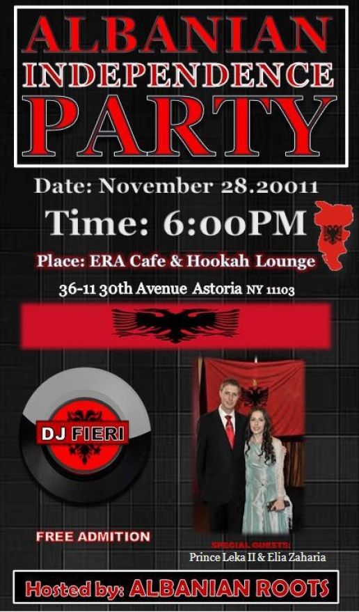 Come celebrate 99 years of freedom with Albanian Roots NGO and our honorary guest PRINC LEKA II (PRINCE OF ALBANIANS) FREE ENTRANCE! 18 TO PARTY 21 TO DRINK! COME ONE COME ALL! GEZUAR DITEN E PAVARSIS! Date: November 28.2011 Time: 6:00PM Place: ERA Cafн© & Hookah Lounge Astoria, NY 11103 For more info contact us at AlbanianRoots@gmail.com www.AlbanianRoots.org