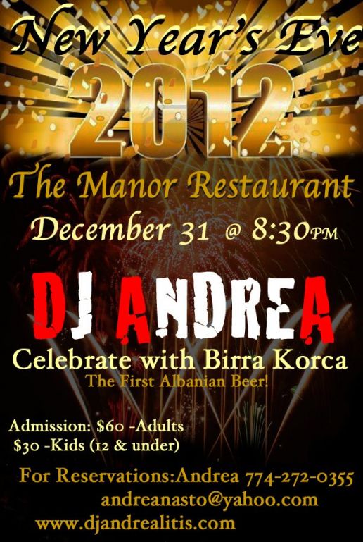 *** New Year's Eve 2012 @ The Manor Restaurant *** Lets celebrate the New Years eve 2012 at The Manor Restaurant. Music, food, fun, prices. Address :42 West Boylston St . West Boylston MA 01583 Sponsor * The First Albanian Beer - *Birra Korca* Starts @ 8:30 pm Dinner served @ 9:30 - 10:30 pm Partying till 1:30 am Admission : $60 - Adults $30 - Kids (12 & under) For reservations : Andrea @ (774)272-0355 Email : andreanasto@yahoo.com