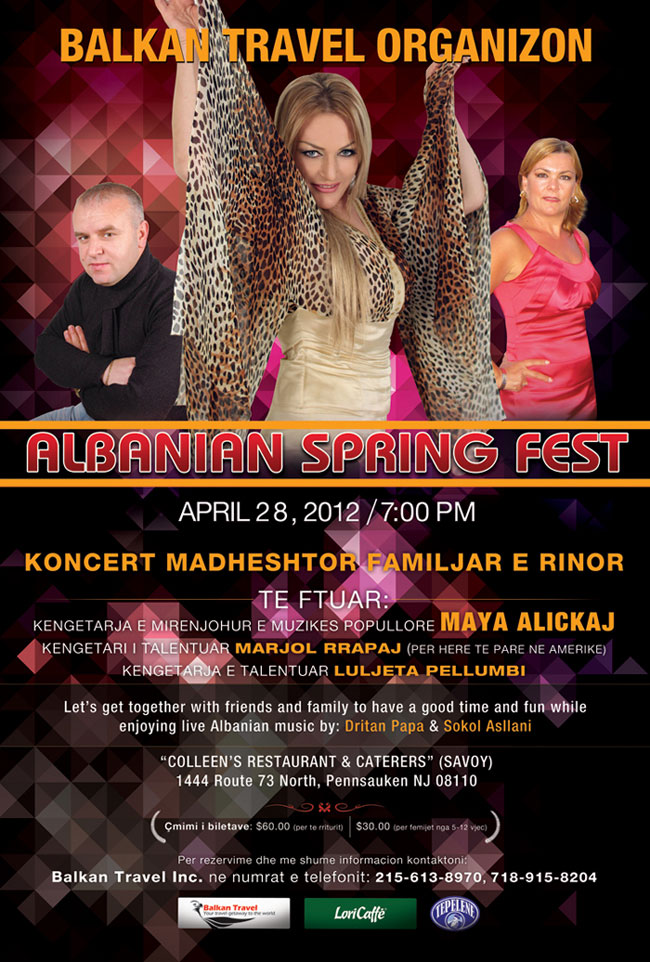 KONCERT MADHESHTOR FAMILJAR E RINOR TE FTUAR KENGETARJA E MIRENJOHUR E MUZIKES POPULLORE думMAYA ALICKAJдуќ KENGETARI I TALENTUAR MARJOL RRAPAJ KENGETARJA E TALENTUAR LULJETA PELLUMBI Ne Restorantin: думCOLLEENду»S RESTAURANT & CATERERSдуќ (SAVOY) 1444 Route 73 North, Pennsauken NJ 08110 Letду»s get together with friends and family to have a good time and fun while enjoying live Albanian music by Dritan Papa and Sokol Asllani. Cmimi I biletave: $60.00 per te rriturit $30.00 per femijet deri ne 12 vjec Per rezervime dhe me shume informacion kontaktoni: Balkan Travel In ne numrat e telefonit 215-613-8970 dhe 718-915-8204