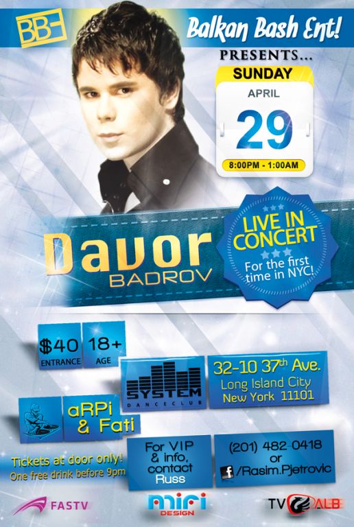 ** DAVOR BADROV for the first time LIVE in NYC!! ** ** All tickets sold at the door ONLY ** ** Entrance is $40 and 18+ for all ** ** Doors open 8pm-1am...FREE drink before 9pm ** Davor Badrov is the future of Bosnian music. He is only 19 years old and already has HUGE hits like Ne Brini Oce, Jedina, Momacka, Subota Je Ludilo, etc...DJ aRPi will be spinning the house and narodna while DJ Fati will be spinning the Albo and hiphop. FOR VIP, please send a $100 bank check, money order, or cash to: Rasim Pjetrovic PO Box 1762 Fort Lee, NJ 07024 (2 BOTTLE MINIMUM & NO personal checks...Must arrive by 9pm for your table reservation or else you forfeit the table) This will secure your table and bottles will be $250 each (tax/tip included). There are only 14 large tables at SYSTEM and a hand full of single bottle tables that will be given away at the door...RSVP now because this night will be at capacity real fast! Rasim Pjetrovic (Russ) Office (201) 482-0418